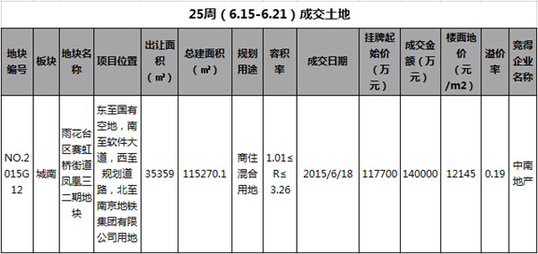 关键词为:2015年第25周土地成交信息
